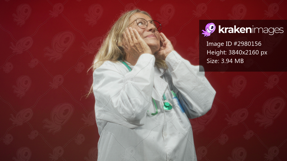Doctor senior woman in white coat with stethoscope, hands to cheeks and looking upward against red studio backdrop; hopeful reflection.