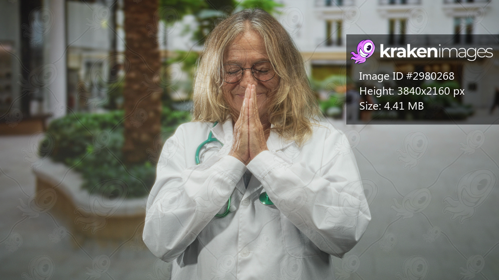 Doctor senior woman in white coat with stethoscope presses hands together in prayer, eyes closed and glasses visible, standing on an urban street plaza by a building; healing calm. - Kraken Images