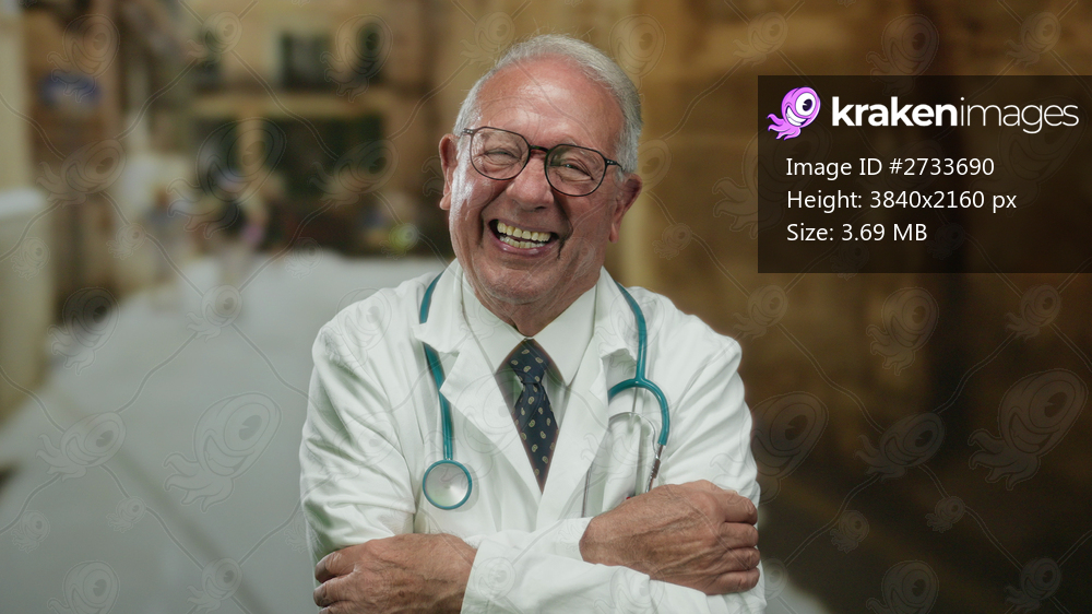 Doctor smiling with arms crossed in a busy outdoor street, wearing a white coat and stethoscope, capturing a cheerful and professional presence amid a blurred urban setting. - Kraken Images