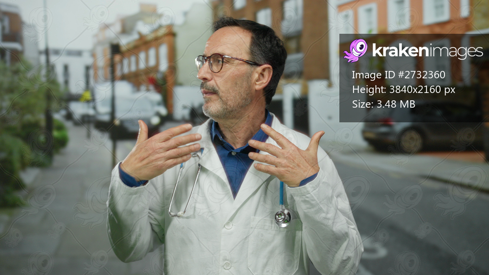 Doctor standing outdoors in an urban street setting with a stethoscope, wearing glasses, and appearing thoughtful in a city environment.