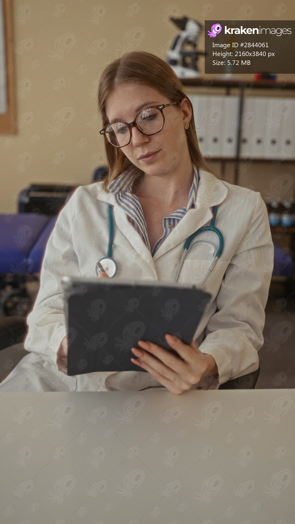 Doctor with stethoscope and glasses reviews patient records on touchscreen tablet in clinic; dedication.