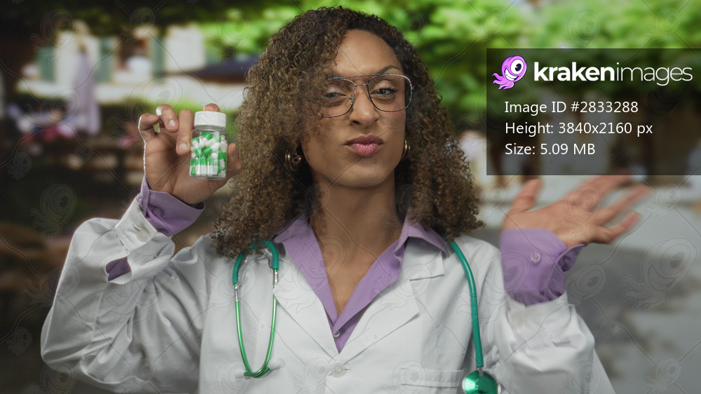 Doctor with stethoscope holding green pill bottle and open palm gesture on outdoor city street in daylight; care trust wellness.