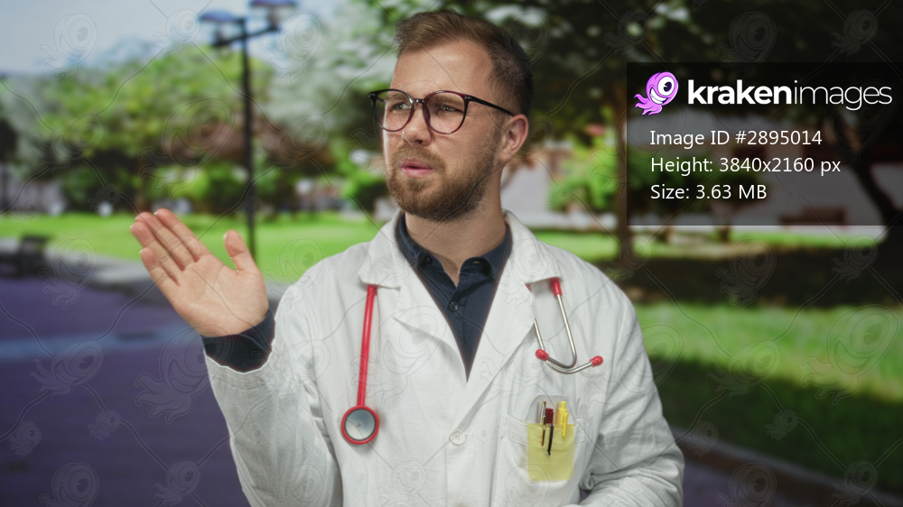 Doctor with stethoscope waving right hand in park walkway among trees and benches, wearing white coat and glasses; reassurance care.