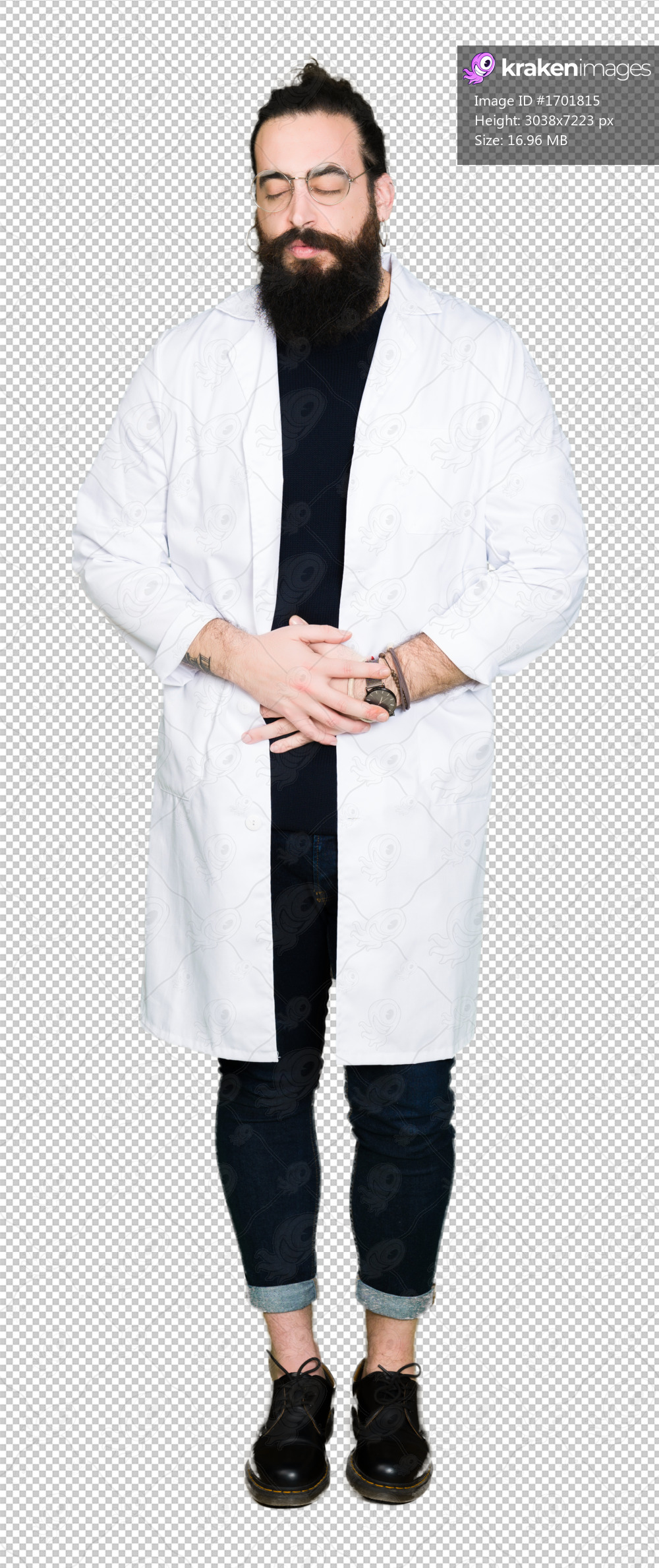 Doctor therapist man with long hair and bear wearing white coat with hand on stomach because indigestion, painful illness feeling unwell. Ache concept. - Kraken Images