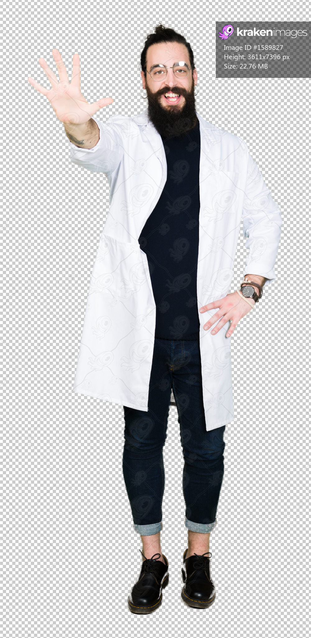 Doctor therapist man with long hair and bear wearing white coat showing and pointing up with fingers number five while smiling confident and happy.
