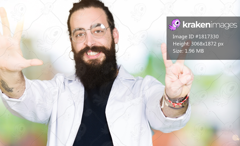 Doctor therapist man with long hair and bear wearing white coat showing and pointing up with fingers number seven while smiling confident and happy.