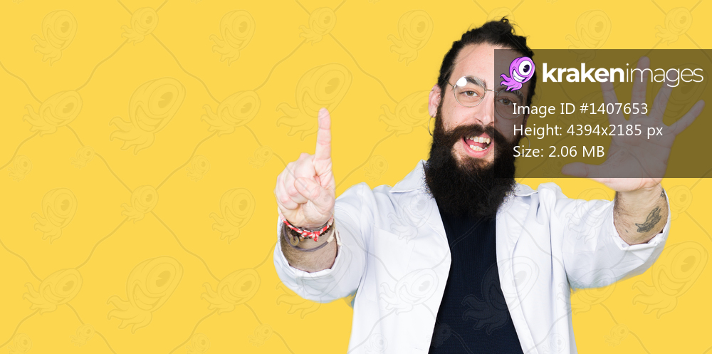 Doctor therapist man with long hair and bear wearing white coat showing and pointing up with fingers number six while smiling confident and happy.