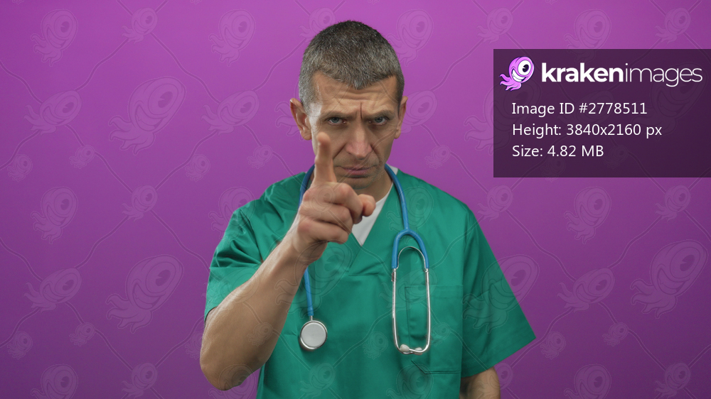 Doctor wearing green uniform with stethoscope gestures against a vibrant purple background, emphasizing a point in a professional and isolated setting. - Kraken Images