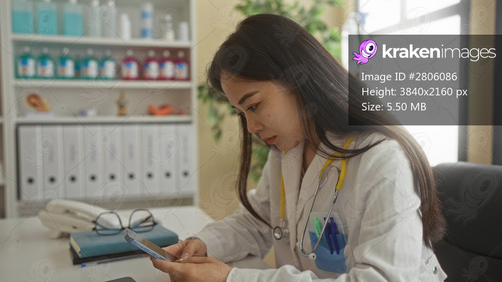 Doctor wearing stethoscope using smartphone in a hospital room, surrounded by medical supplies and files, conveying a focused professional working atmosphere. - Kraken Images