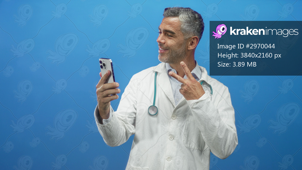 Doctor wearing white coat and stethoscope holds smartphone and gives thumbs up in studio, middle aged man grey hair smiling while looking at phone; reassurance telemedicine. - Kraken Images