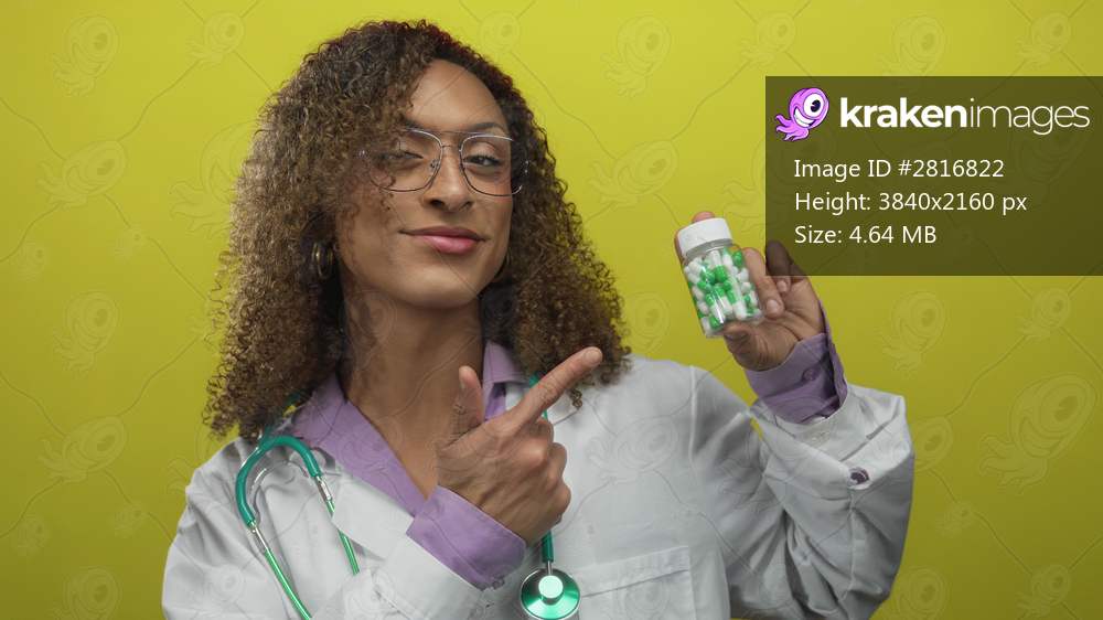 Doctor woman holds green and white pill bottle with stethoscope around neck in bright yellow studio; confidence.