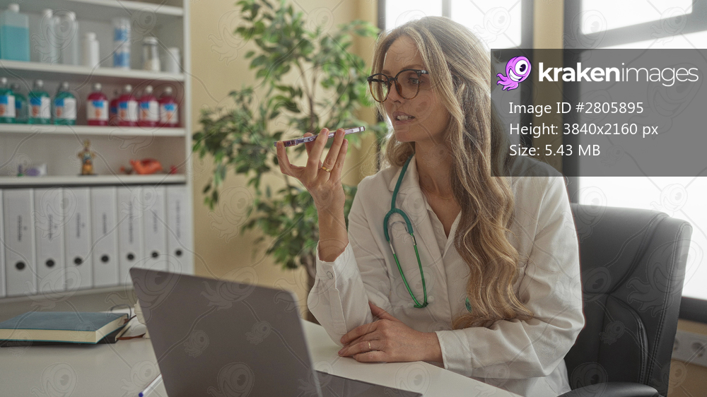 Doctor woman in uniform with stethoscope working at computer in hospital room using phone for communication while surrounded by medical equipment and books - Kraken Images
