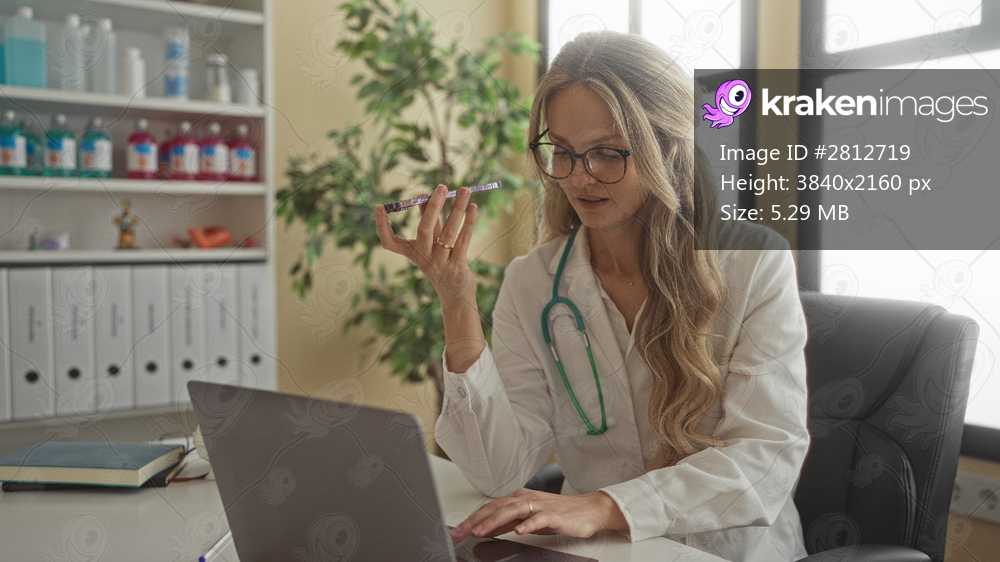 Doctor woman in uniform with stethoscope working at computer in hospital room using phone for communication while surrounded by medical equipment and books - Kraken Images