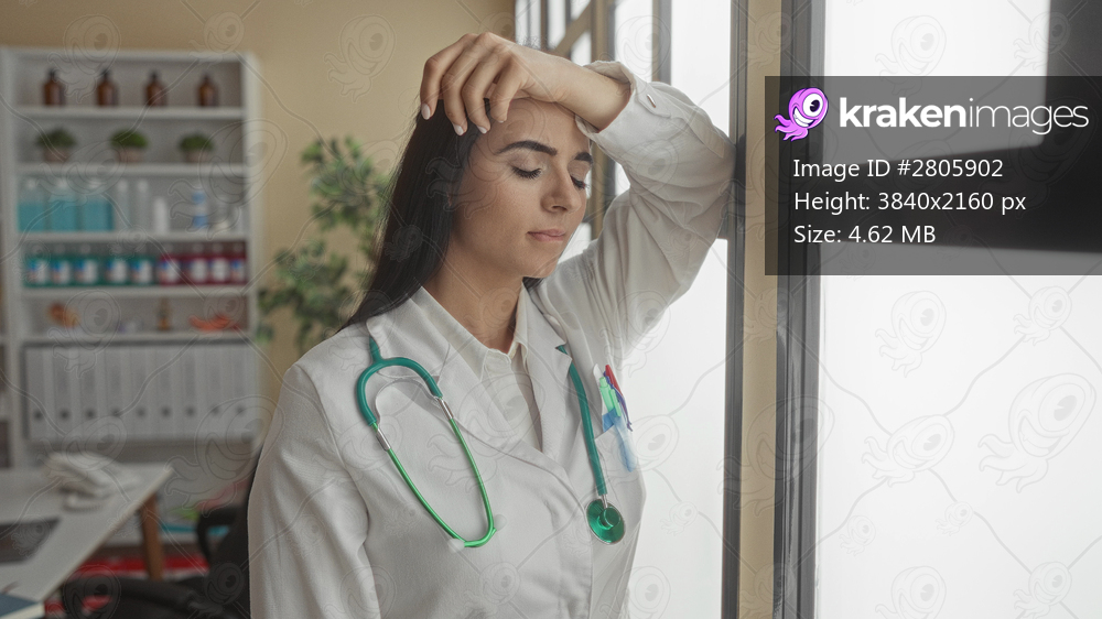 Doctor woman looking thoughtful by a window in a clinic with a stethoscope, appearing to contemplate in the hospital room environment.