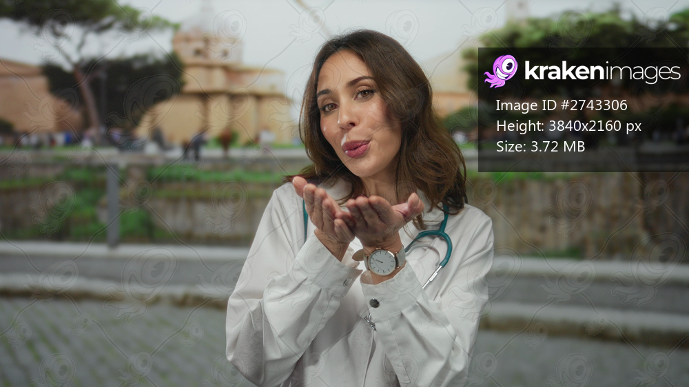 Doctor woman sends hand kisses in front of roman ruins in city street, showcasing a blend of medicine and history in an urban outdoor setting with stethoscope. - Kraken Images