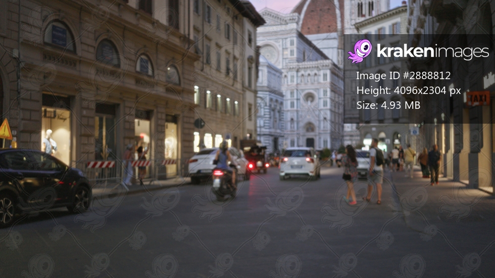 Downtown street scene in soft defocused bokeh with historic cathedral facade and illuminated storefronts, street; background backdrop copyspace calm.