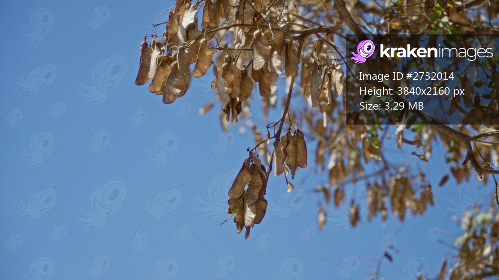 Dry seed pods hanging on tree branches against a clear blue sky in torrevieja, spain, highlighting the sunny outdoor setting and natural beauty of the region. - Kraken Images