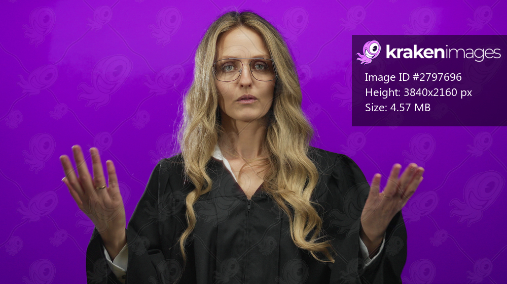 Dynamic film still shows young blonde woman judge uniform over isolated purple background wall delivering confident gesturing with poised hands.