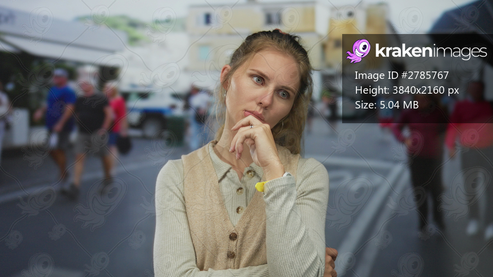Editorial portrait features woman hand thinking street blonde young pensive chin contemplation urban atmosphere.