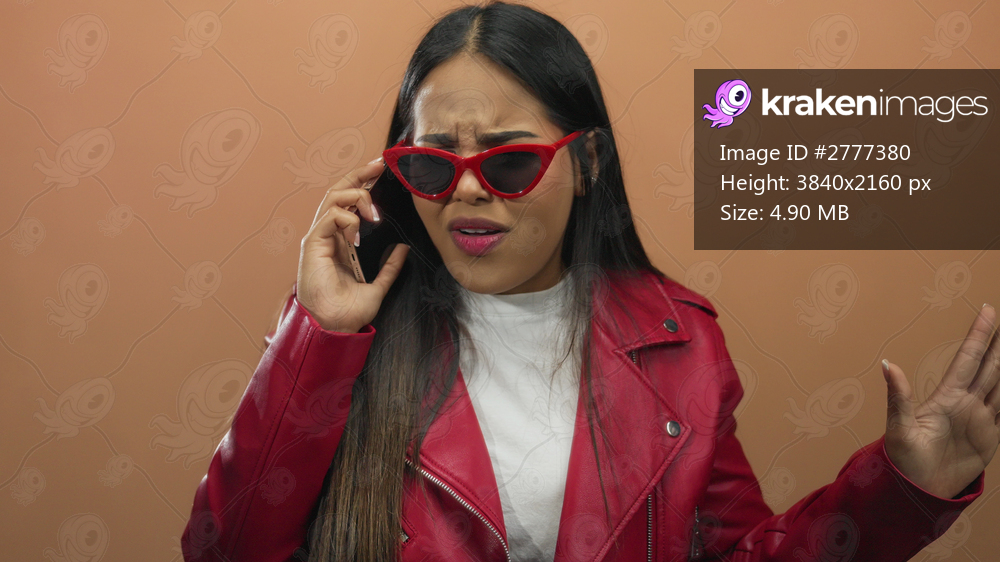 Editorial portrait shows woman with a phone in an angry pose against a wall, highlighting young latin hispanic identity on a brown isolated background. - Kraken Images