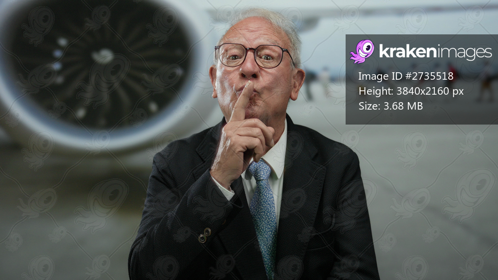 Elderly businessman in a suit stands with a finger to his lips in an outdoor airport setting near a plane engine, conveying silence and discretion