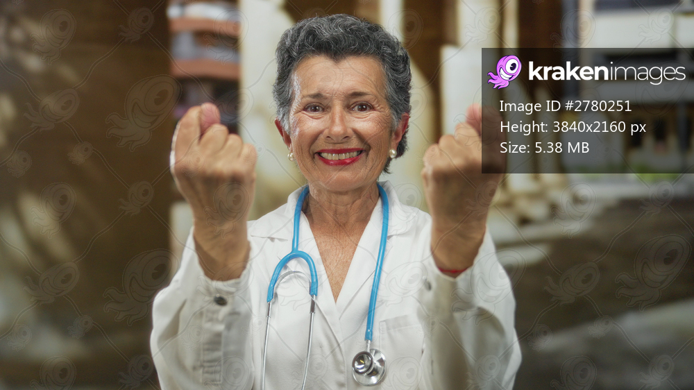 Elderly female doctor with grey hair smiling and holding fingers crossed wearing a stethoscope and lab coat in an old town urban street setting conveying optimism. - Kraken Images