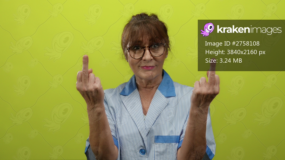 Elderly hispanic woman cleaner expressing defiance against a vibrant yellow backdrop while wearing glasses and uniform indoors with determined expression - Kraken Images