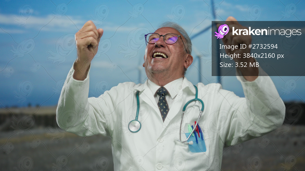 Elderly male doctor celebrating outdoors in front of windmill and field wearing white uniform smiling joyfully with raised arms on a sunny day representing success energy and health. - Kraken Images