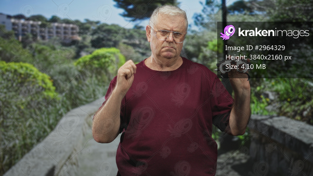 Elderly man holding phoropter and wearing eyeglasses, squints and gestures during eye examination by building; vision concern.