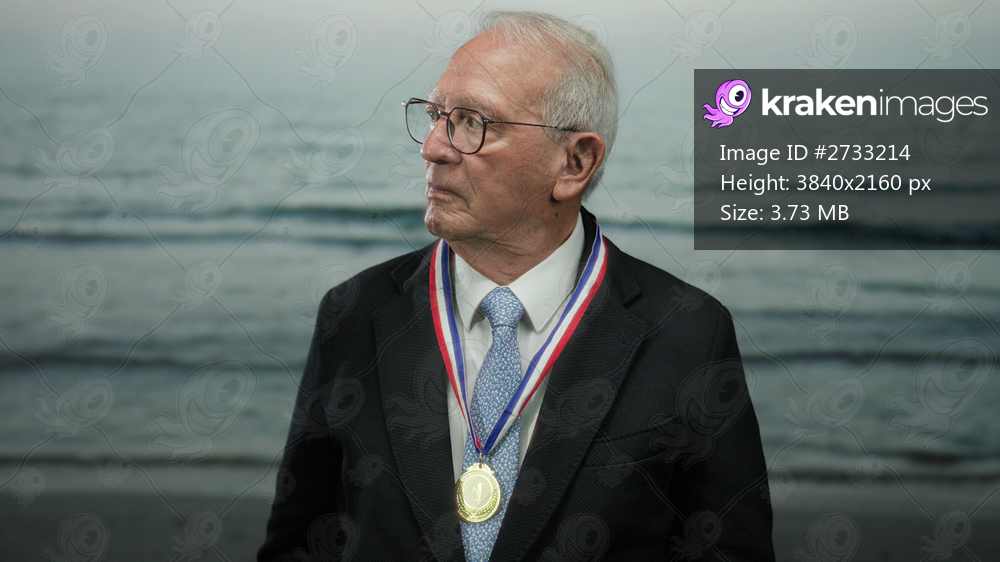 Elderly man in a business suit with a medal stands solemnly at the seaside, with the ocean waves gently rolling onto the beach in the background.
