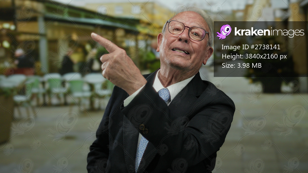 Elderly man in a suit points angrily on a restaurant terrace, emphasizing an outdoor street setting with business attire and expressive demeanor.