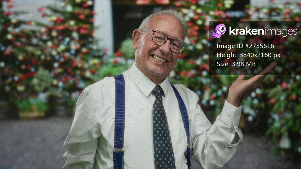 Elderly man in a suit smiling outdoors with palms extended near festive christmas trees on a street, capturing a joyful holiday spirit.