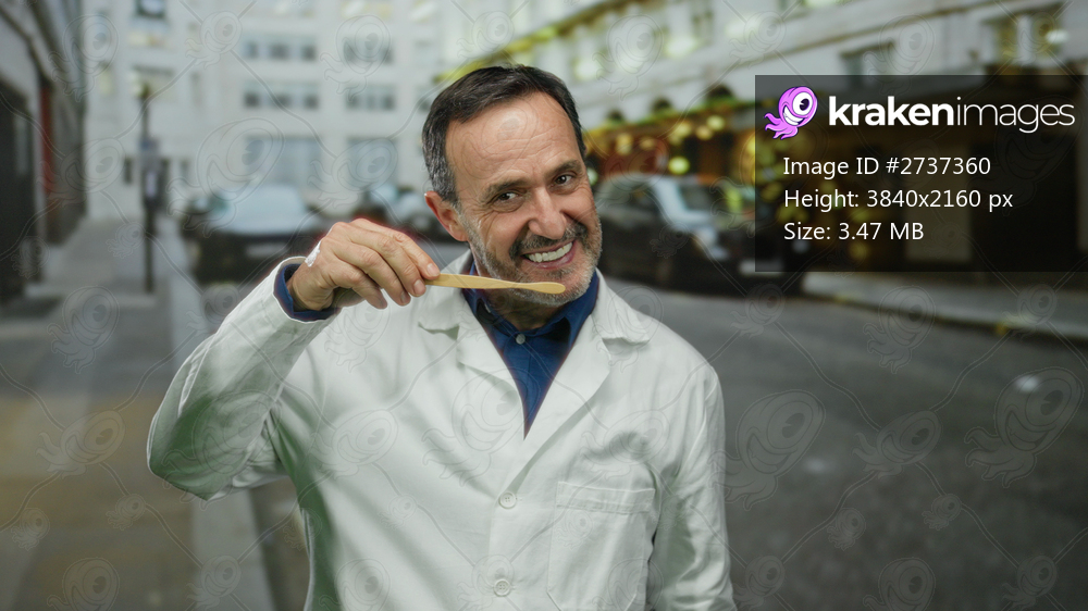 Elderly man in a white coat smiles while inspecting a toothbrush on an urban street, blending professional focus with a casual outdoor city vibe.