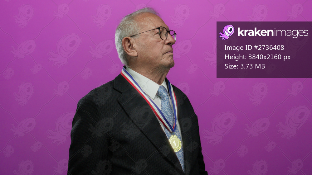 Elderly man in business suit with a medal stands confidently against an isolated pink background showing achievement and professionalism.