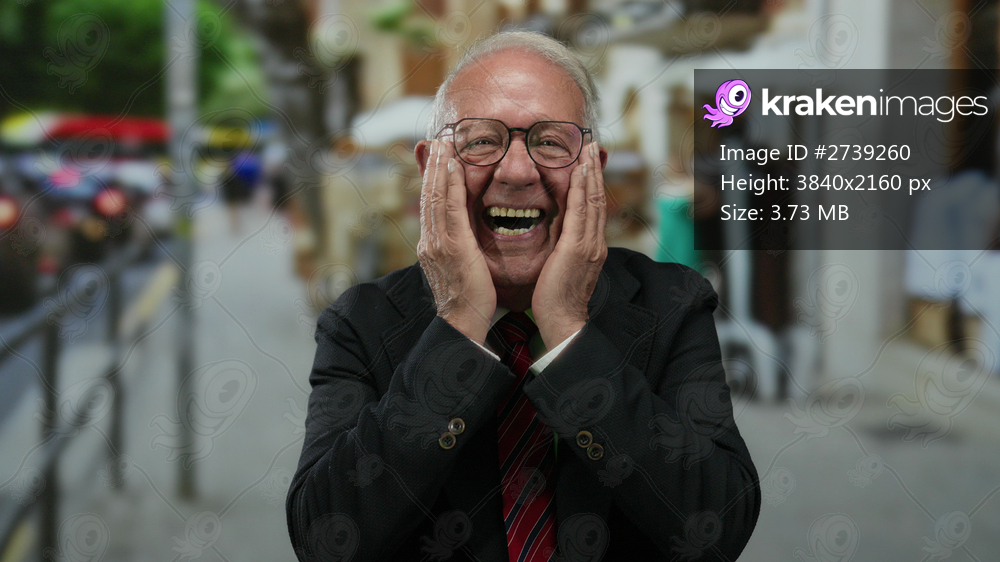 Elderly man in business suit expressing joy outdoors on a bustling city street, with vibrant urban background and joyful demeanor.