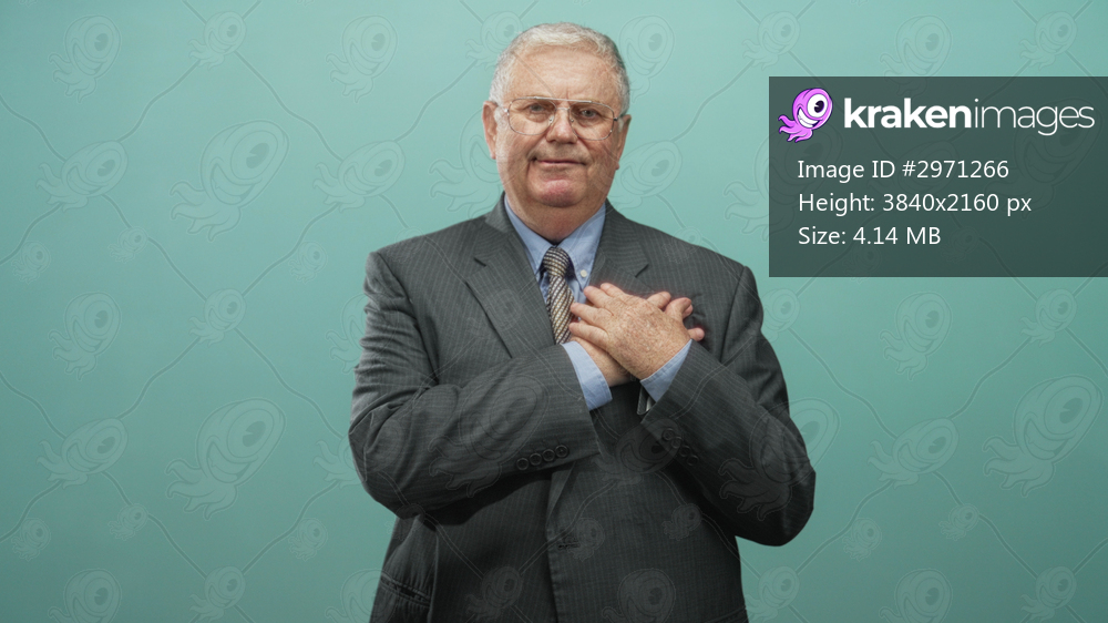 Elderly man in gray business suit and tie holds hands over chest in studio against teal seamless backdrop; sincerity gratitude hope.