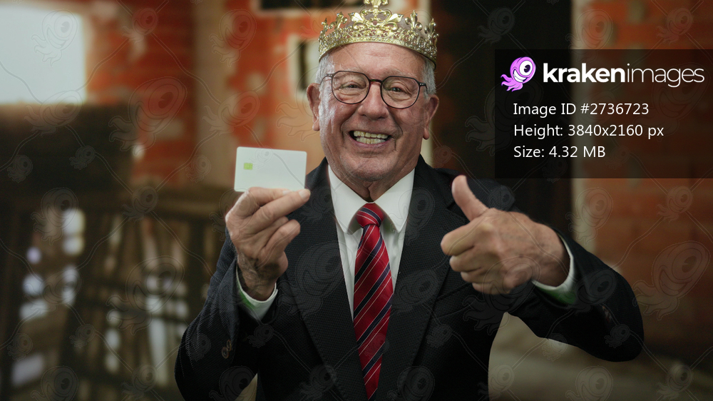 Elderly man in suit and crown gives thumbs up, holding card at indoor construction site, embodying business and triumph.