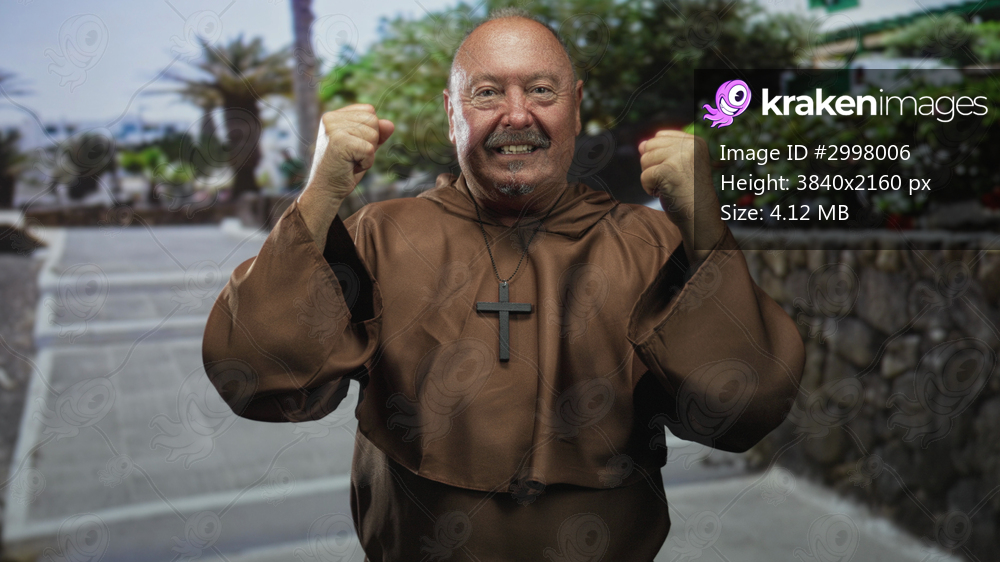 Elderly man monk in brown robe raises clenched fists and displays a large wooden cross necklace along a stone walled street lined with palm trees; triumph faith. - Kraken Images