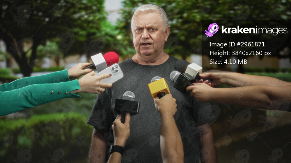 Elderly man speaks while multiple reporters thrust microphones and a smartphone toward his face on a street, surrounded by trees and hedges; concern accountability transparency. - Kraken Images