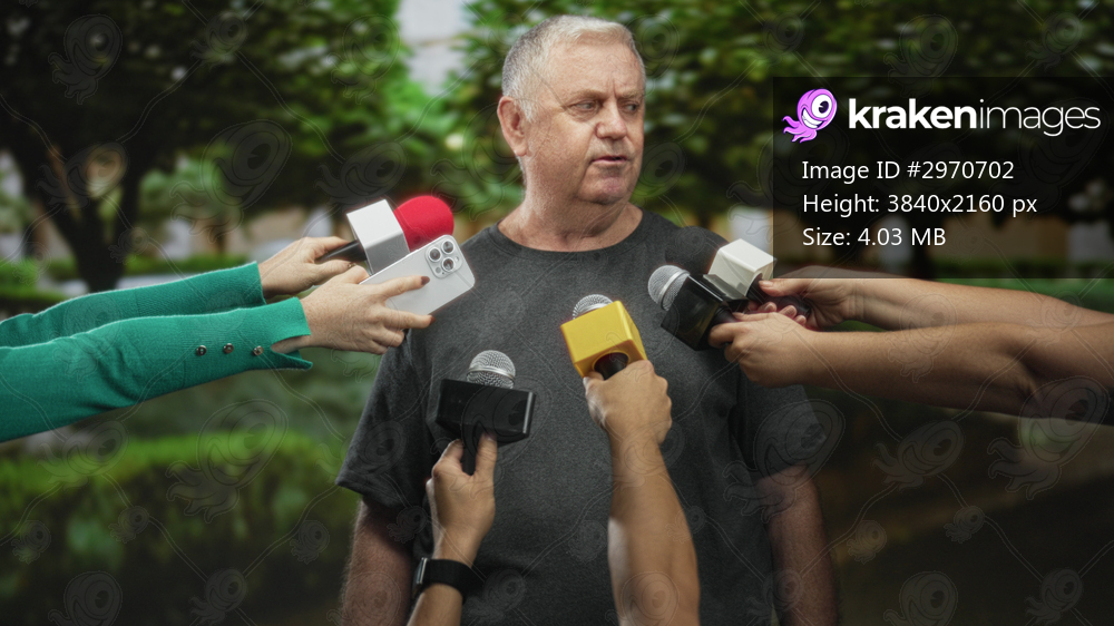 Elderly man speaks while multiple reporters thrust microphones and a smartphone toward his face on a street, surrounded by trees and hedges; concern accountability transparency. - Kraken Images