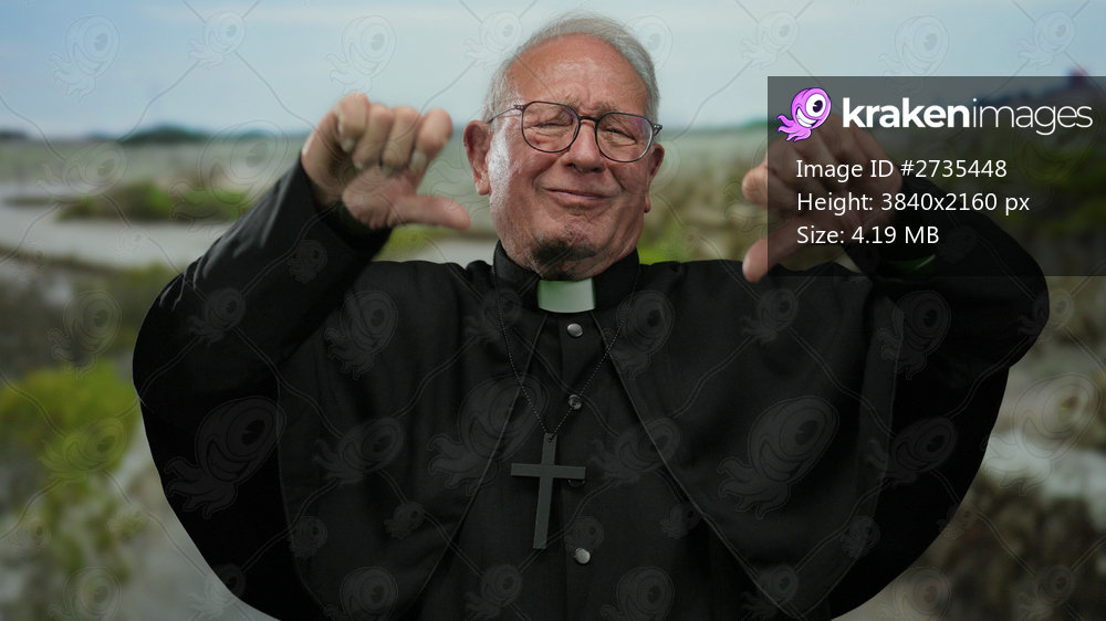 Elderly priest displaying dissatisfaction with both thumbs down in a scenic outdoor park setting.