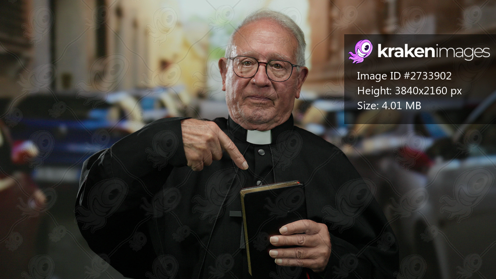 Elderly priest holding a book gestures while standing on a busy street lined with cars, implying a public sermon in an outdoor urban setting.