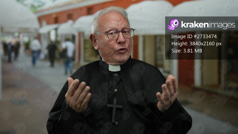 Elderly priest in black robe gestures passionately outdoors on a busy street with people in the background.
