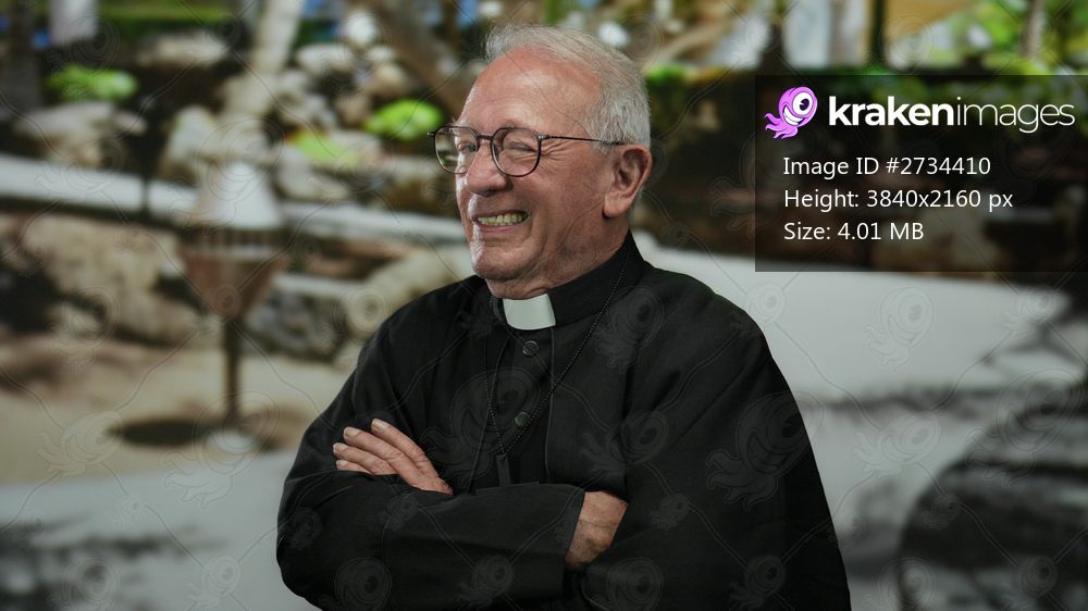 Elderly priest smiling outdoors in a street setting wearing clerical collar and glasses with arms crossed surrounded by nature suggesting a peaceful environment. - Kraken Images