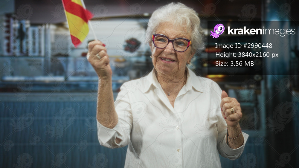 Elderly spanish woman waving a small spain flag with hand, smiling and wearing white shirt and glasses in a studio with oven props; pride support.