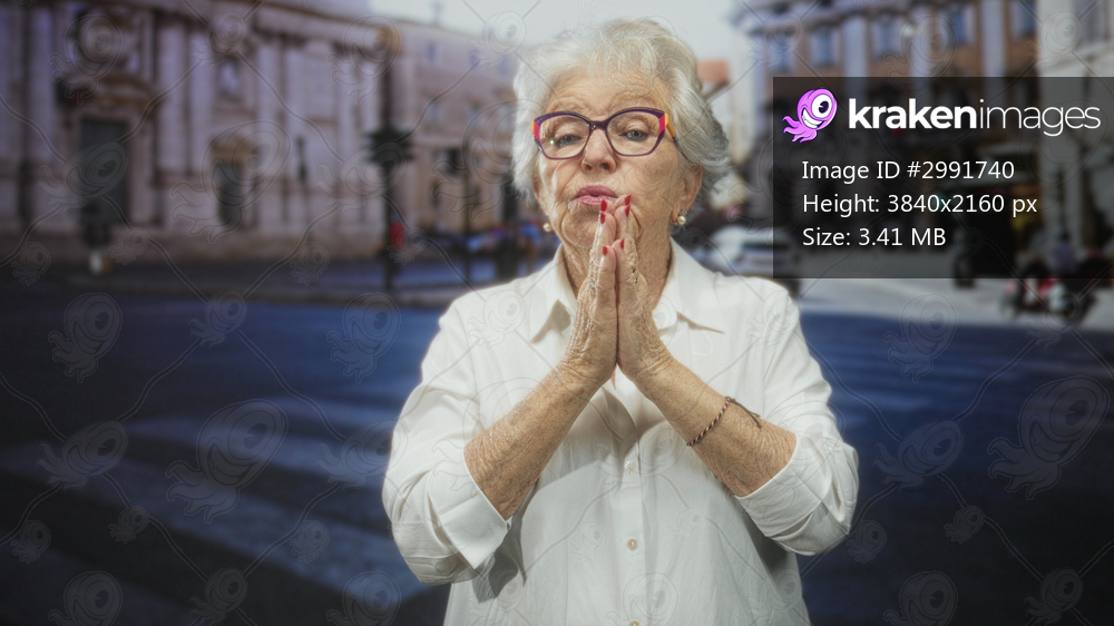 Elderly woman clasping hands near mouth on a street crosswalk by a building, white blouse and glasses; memory plea concern.