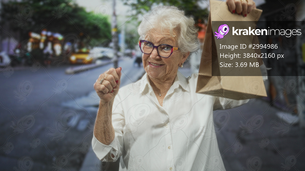 Elderly woman with colorful glasses holding a paper bag aloft and smiling while giving a thumbs up on a busy street; satisfaction joy.