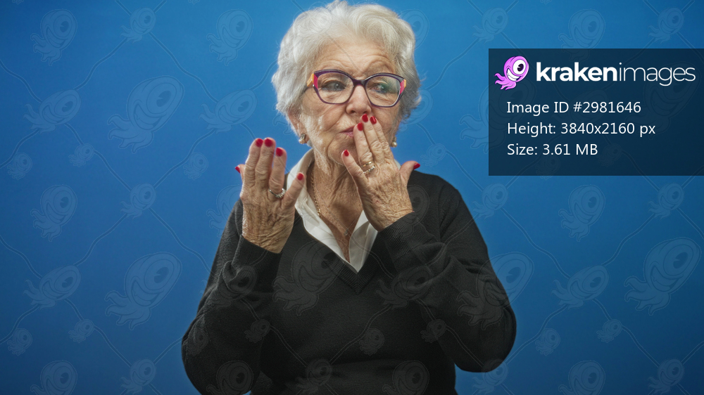 Elderly woman with colorful glasses and red nail polish covers her mouth with both hands then blows a kiss toward the camera in studio; tenderness.