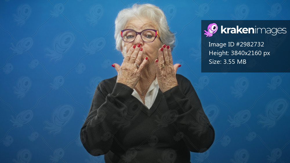 Elderly woman with colorful glasses and red nail polish covers her mouth with both hands then blows a kiss toward the camera in studio; tenderness.