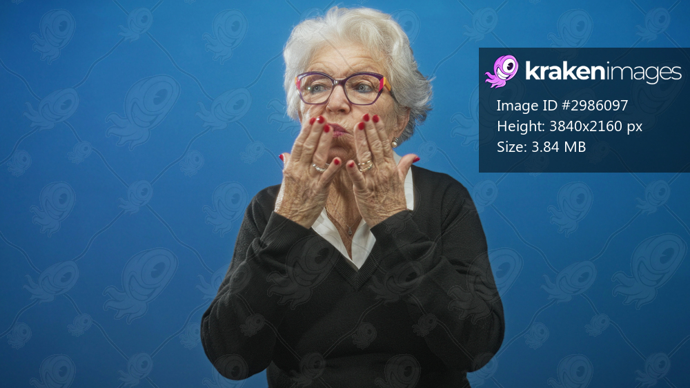 Elderly woman with colorful glasses and red nail polish covers her mouth with both hands then blows a kiss toward the camera in studio; tenderness.